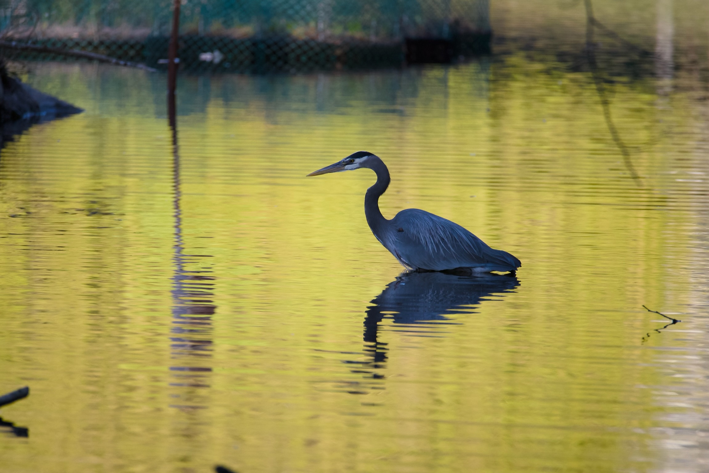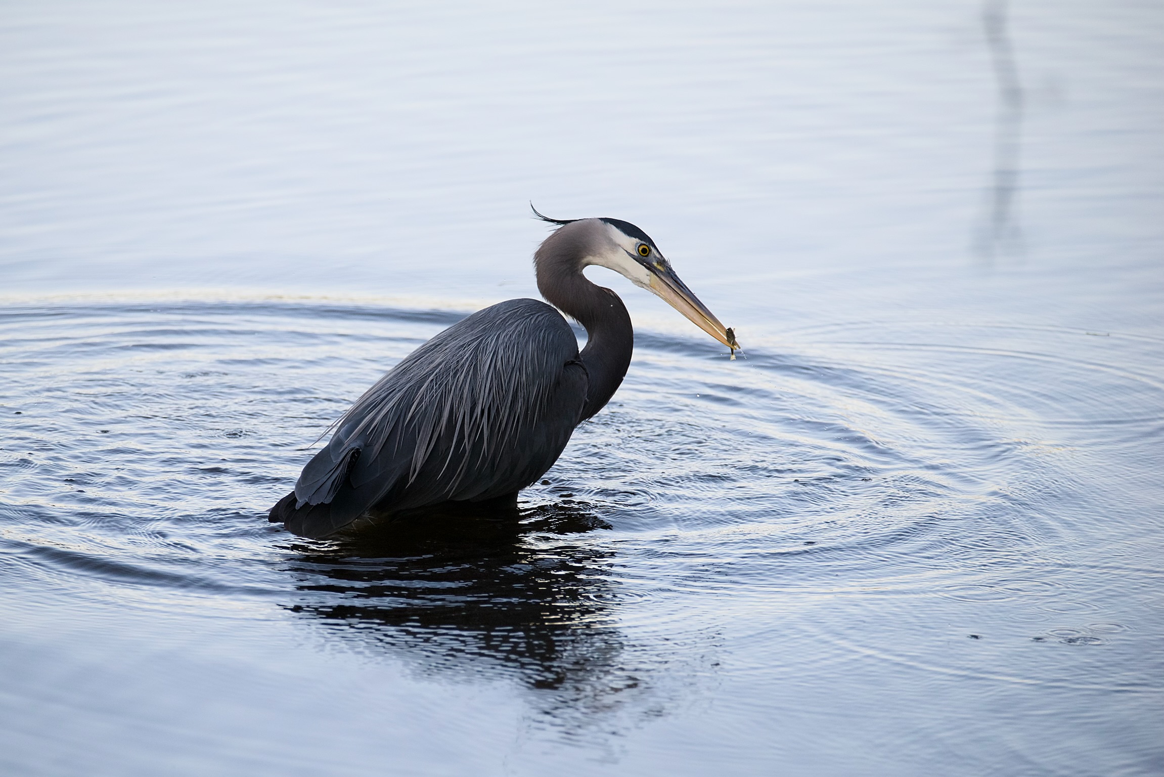 Herons have good eye-sight, are very still, and have strong and flexible necks. These traits are excellent for catching unsuspecting fish below the water. The heron lurches into the perfect spot and waits. Suddenly, its neck snaps into extension, the head thrusts into the water, and snaps its beak. And there’s a fish in its mouth.